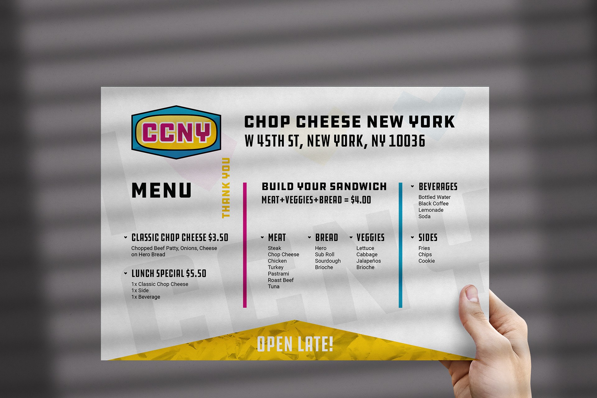 Chop Cheese New York is a ‘chop cheese’ sandwich shop that pays homage to the sandwich that inhabits the bodegas of new York and many other boroughs. The bold font and design is inspired by the city itself, and the colorway expresses the diversity of the people that inhabit these local bodega sandwich shops who have inspired Chop Cheese New York as well as the people of the city.